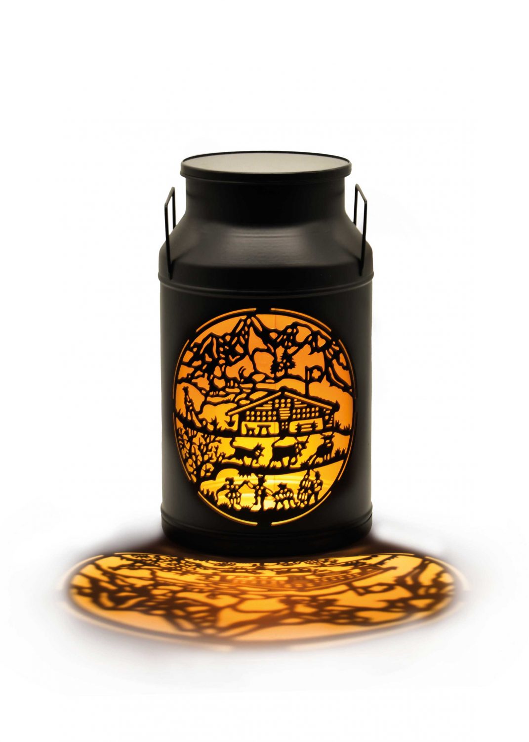 Die Milchkanne ist in dieser Kollektion mit dem Scherenschnitt “Le Chalet” der Künstlerin Esther Gerber verziert worden und bringt die