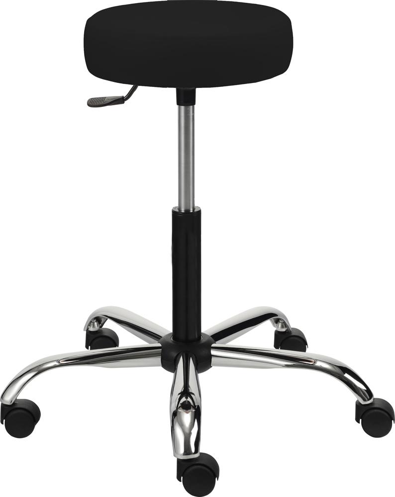 Höhenverstellbarer Arbeitsdrehstuhl ohne Rückenlehne mit hoher Sitzpolsterung und rundem Sitz. Der langlebige Textillederbezug ist bakteriostatisch und besonders Pflegeleicht.