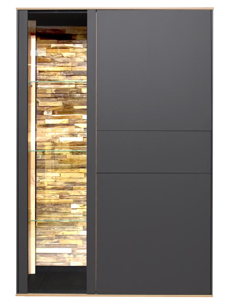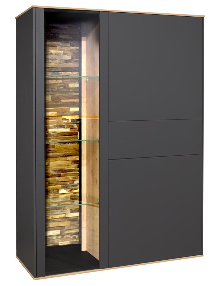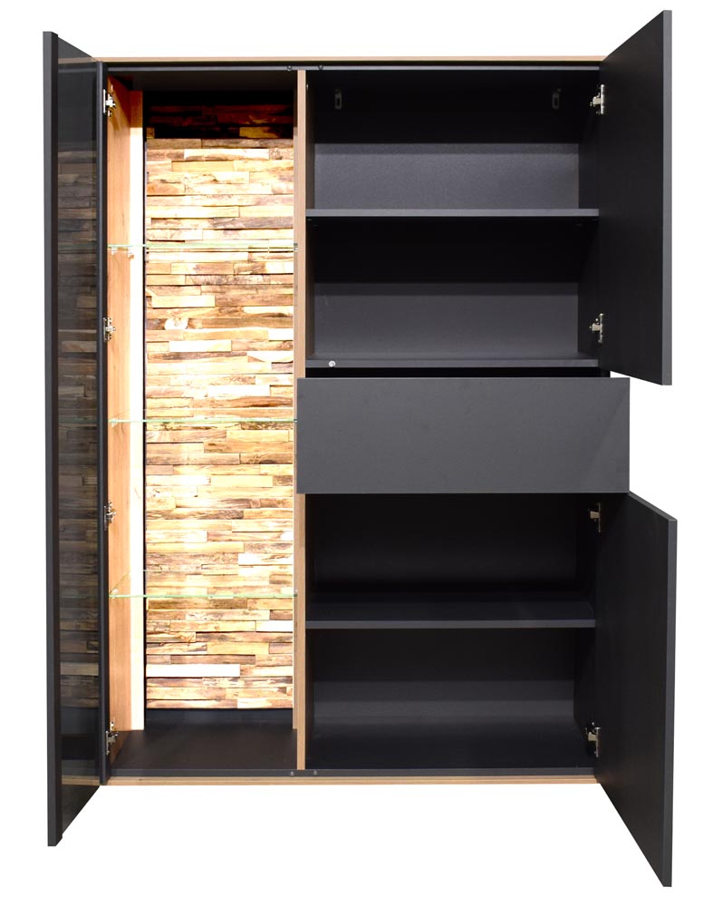 Das Highboard besteht aus 2 Türen, einer Glastür mit Holzapplikation an der Rückwand (inkl. LED-Beleuchtung) sowie einem Schubkasten.