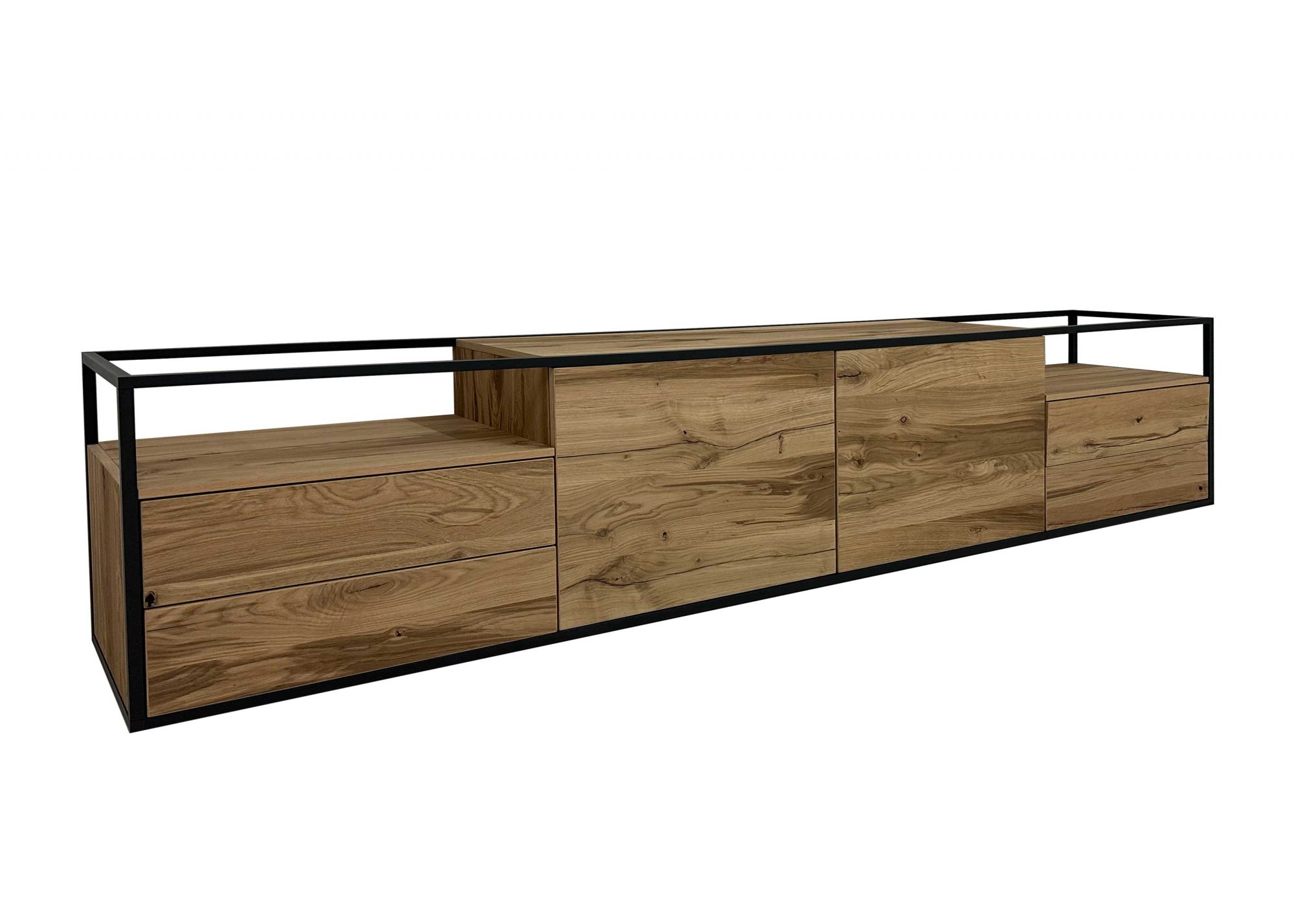 Das Tagena Lowboard wird mit 2 verstellbaren Holzböden und 4 Schubladen mit Vollauszügen geliefert.