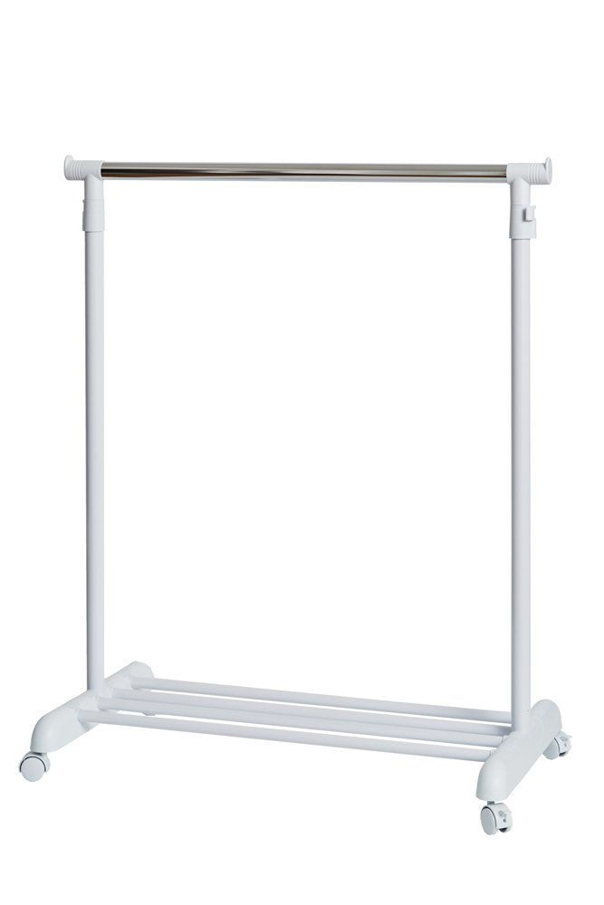 Höhenverstellbare Kleiderstange, mit vier Laufrollen, Feststellbremse und Schuhablage