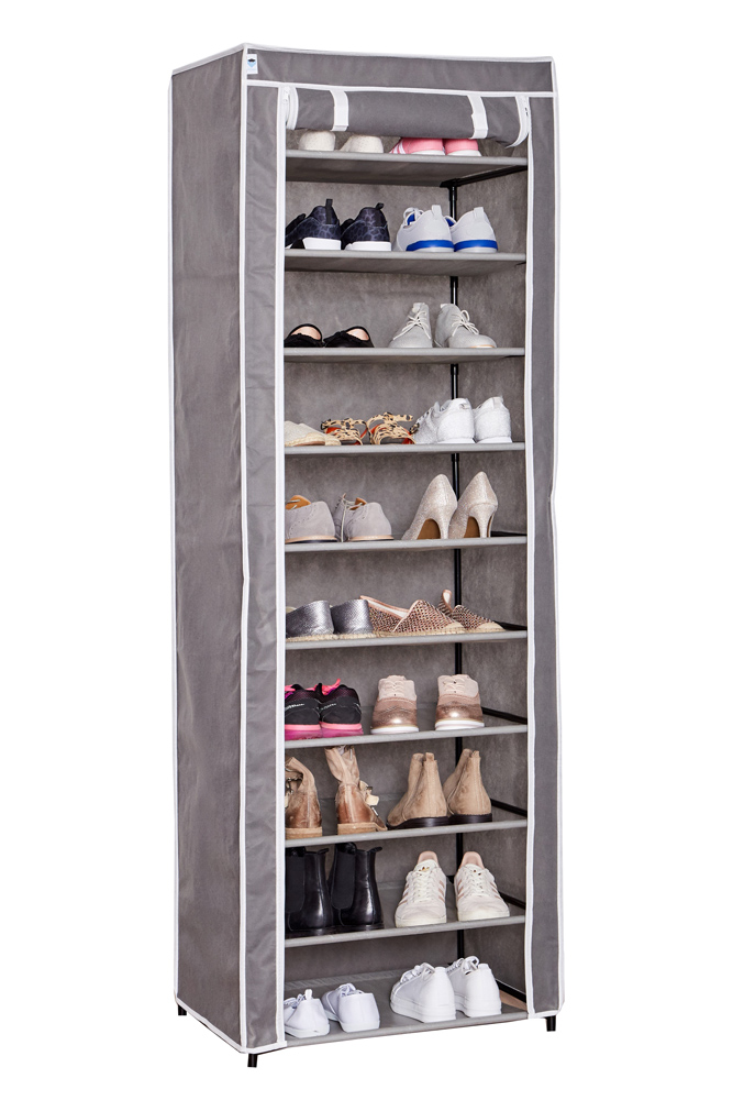 Der textlie Schuhschrank bietet auf 10 Böden Platz für bis zu 40 Paar Schuhen.