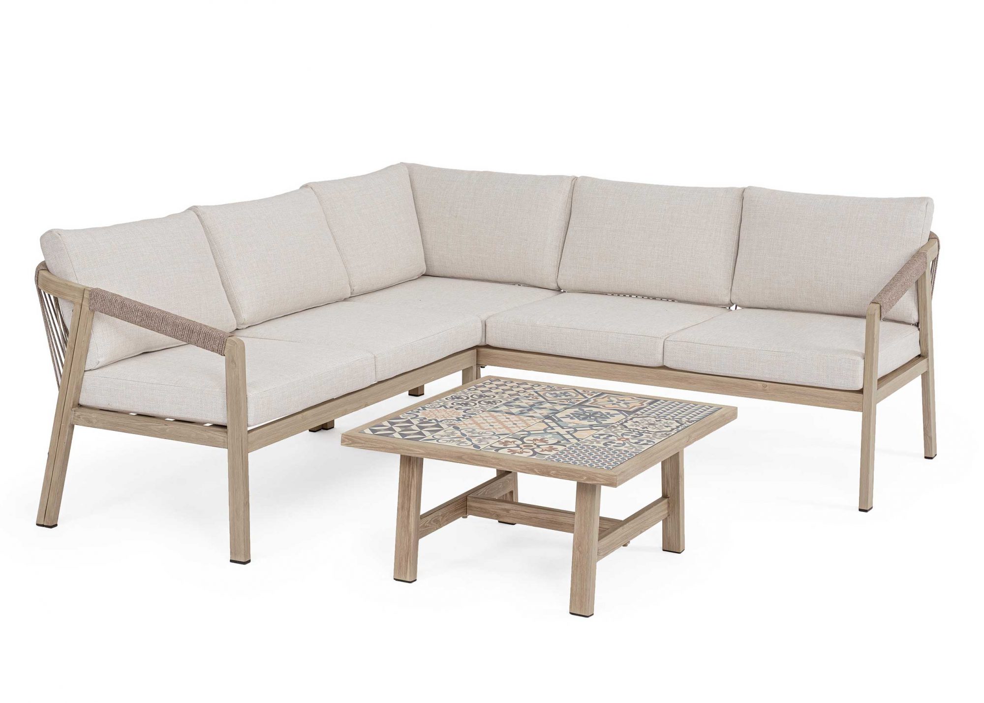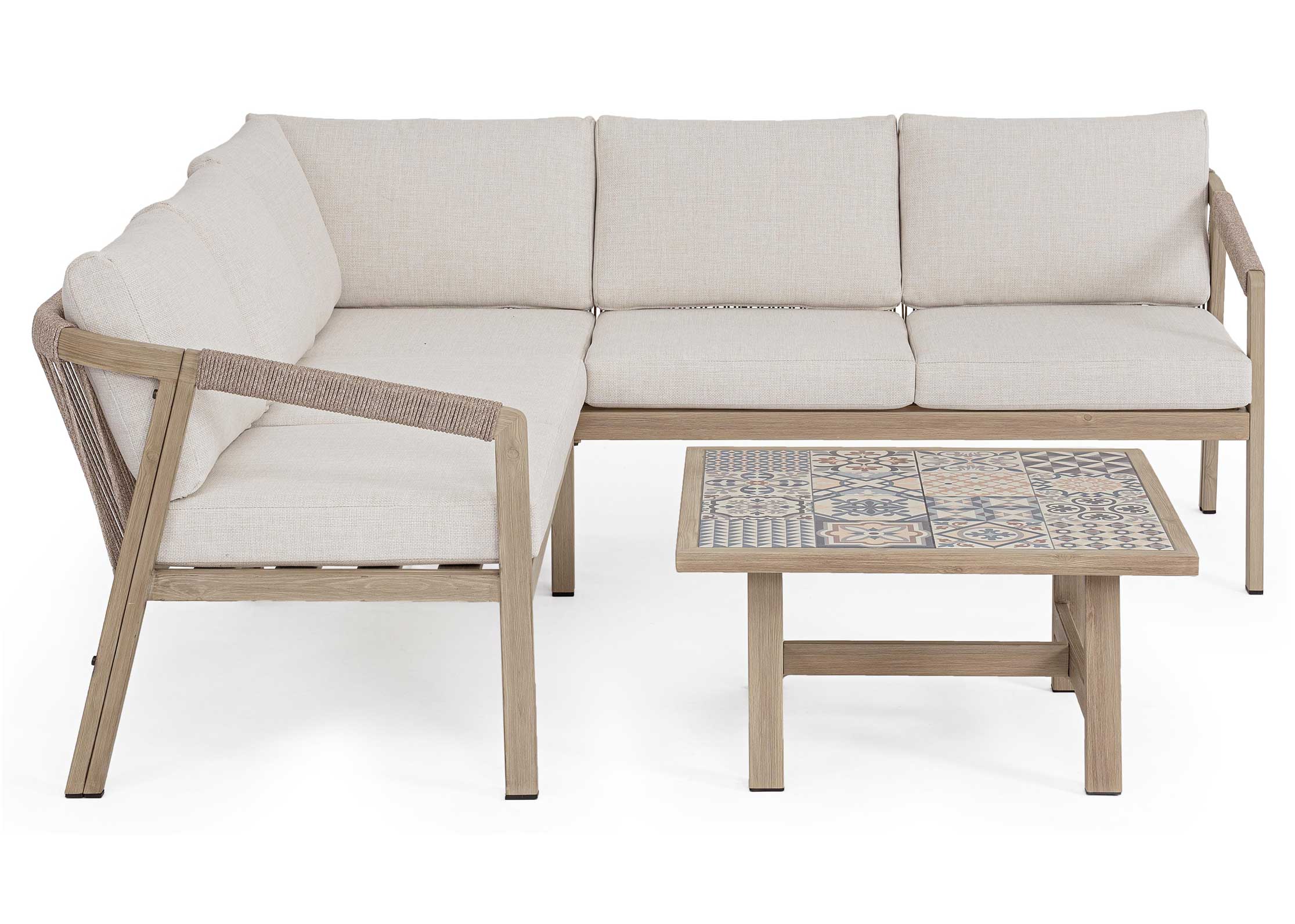Das Lounge-Set besteht aus 1 x 2er Sofa, 1 x 3er Sofa und 1 x Tisch. Das Aluminium-Gestell in holzoptik ist pulverbeschichtet. Die Tischplatte besteht aus emaillierten Porzellanfliesen.