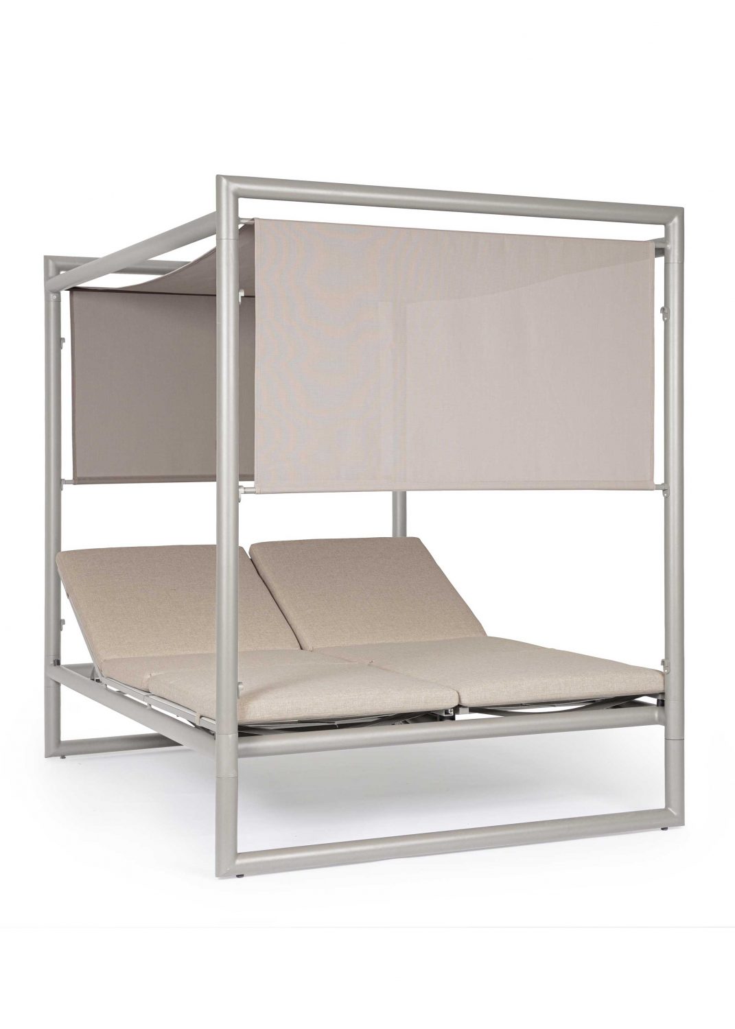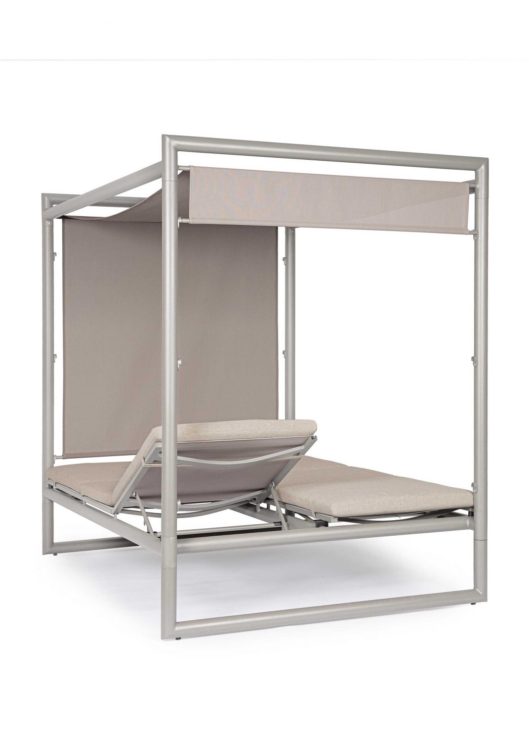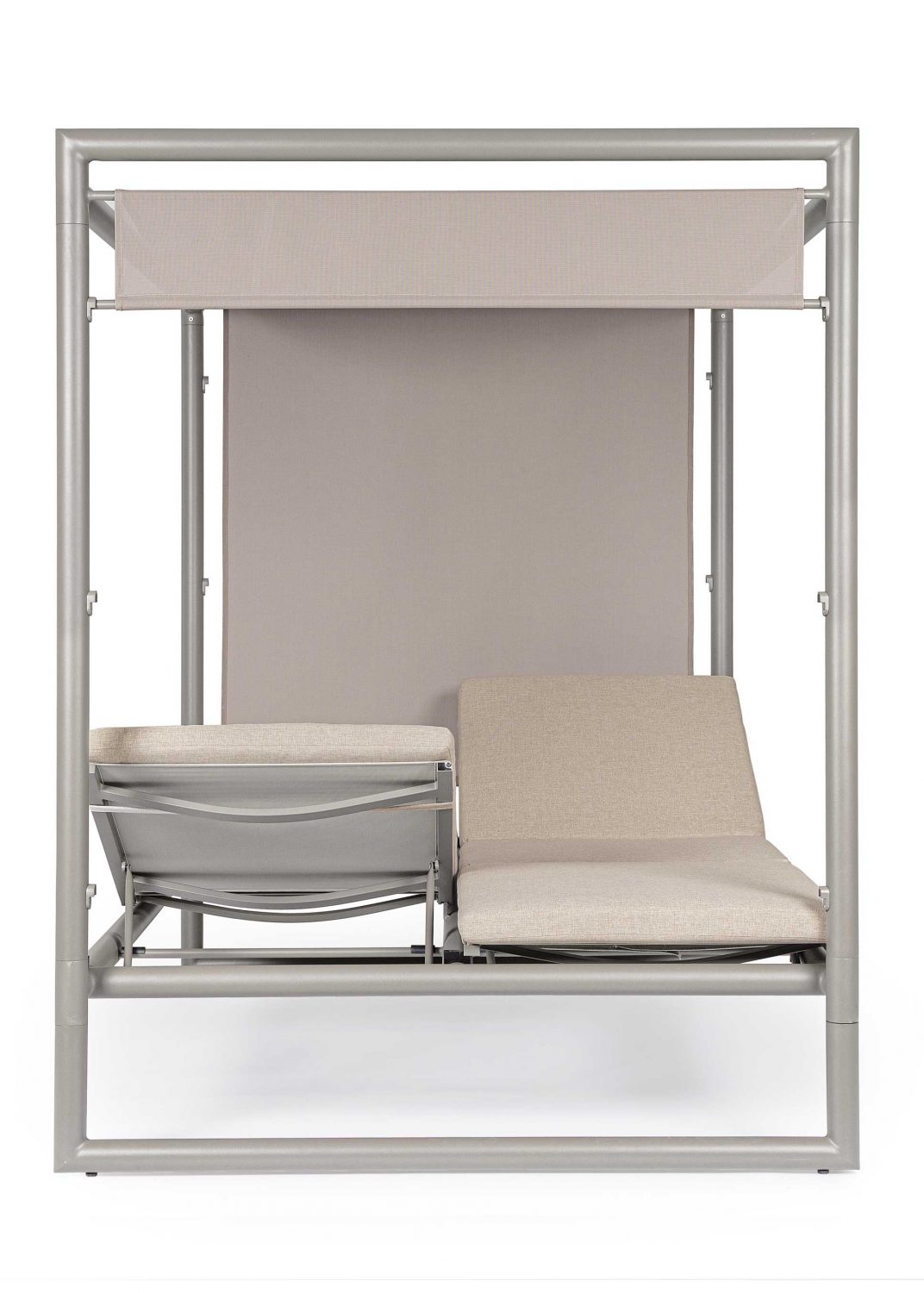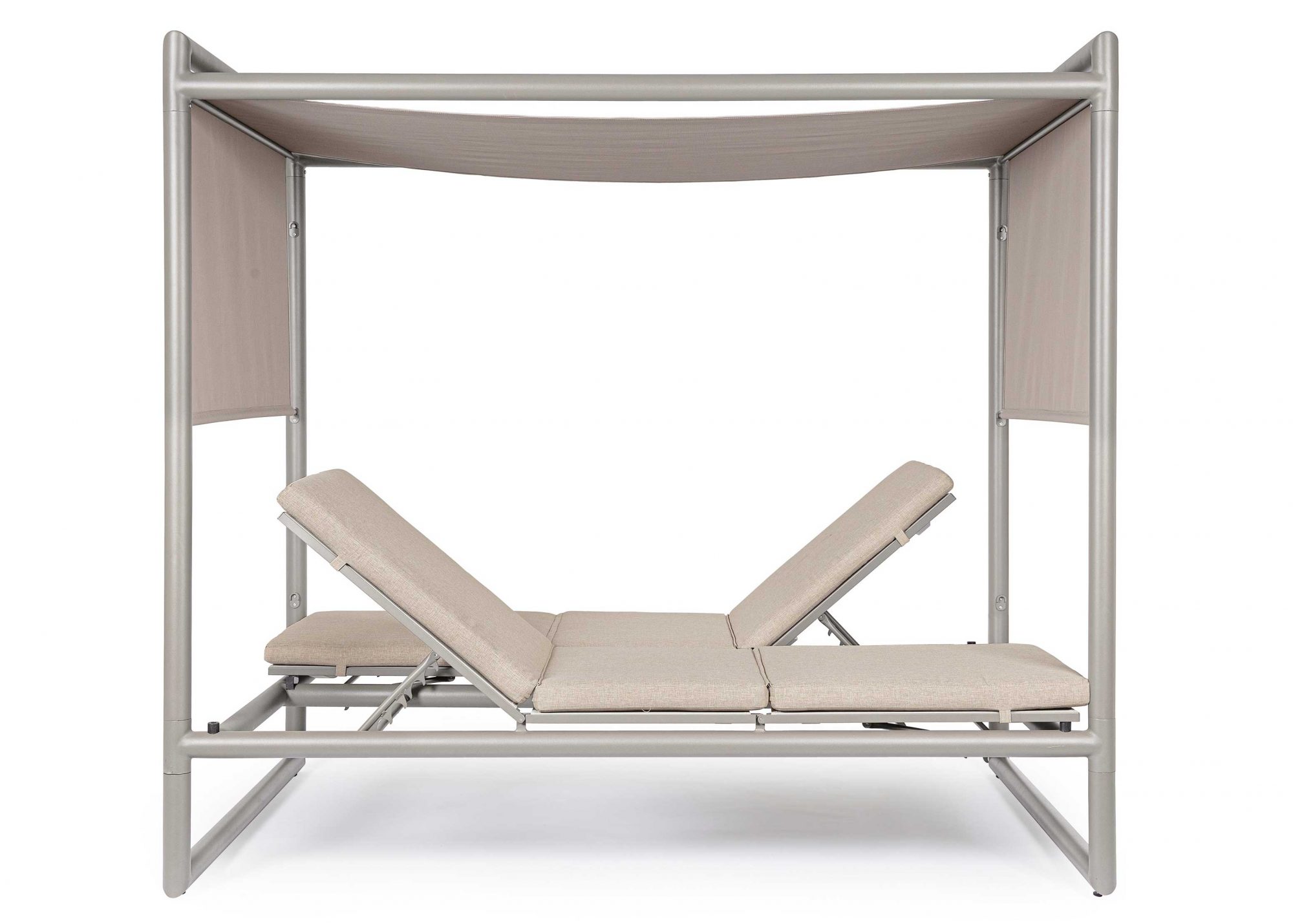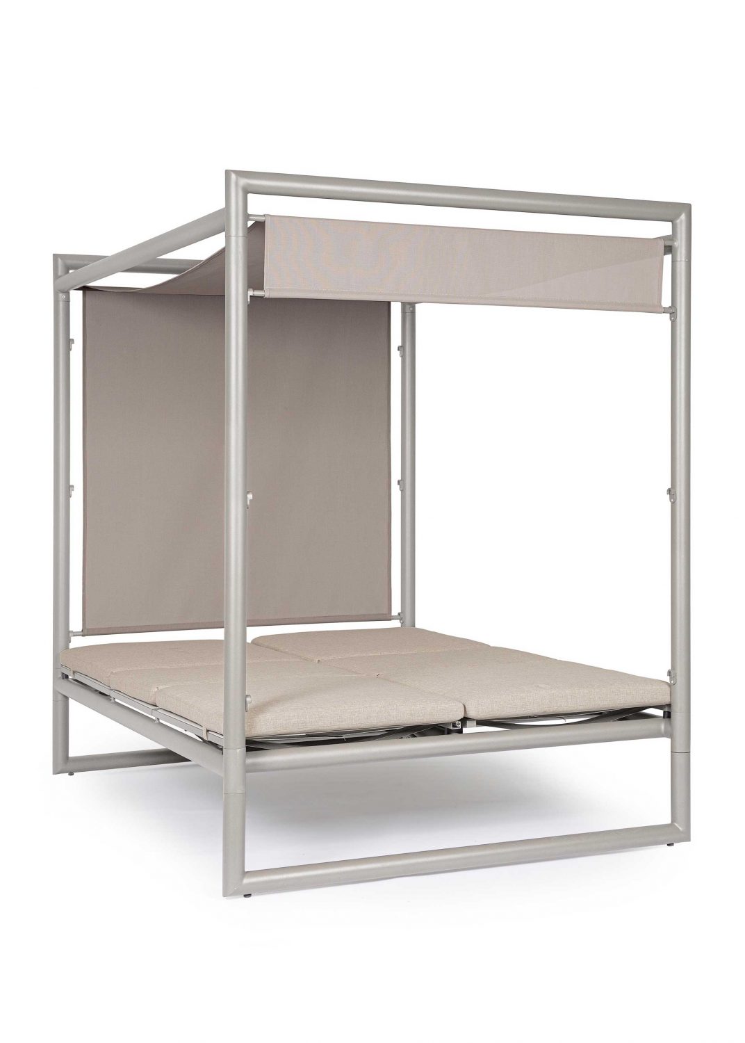 Die Liege ist in 4 Positionen und von beiden Seiten verstellbar. Das Schiebedach lässt sich in 3 Positionen verschieben. Die abziehbaren Kissen sind aus wasserabweisendem Olefin-Gewebe.