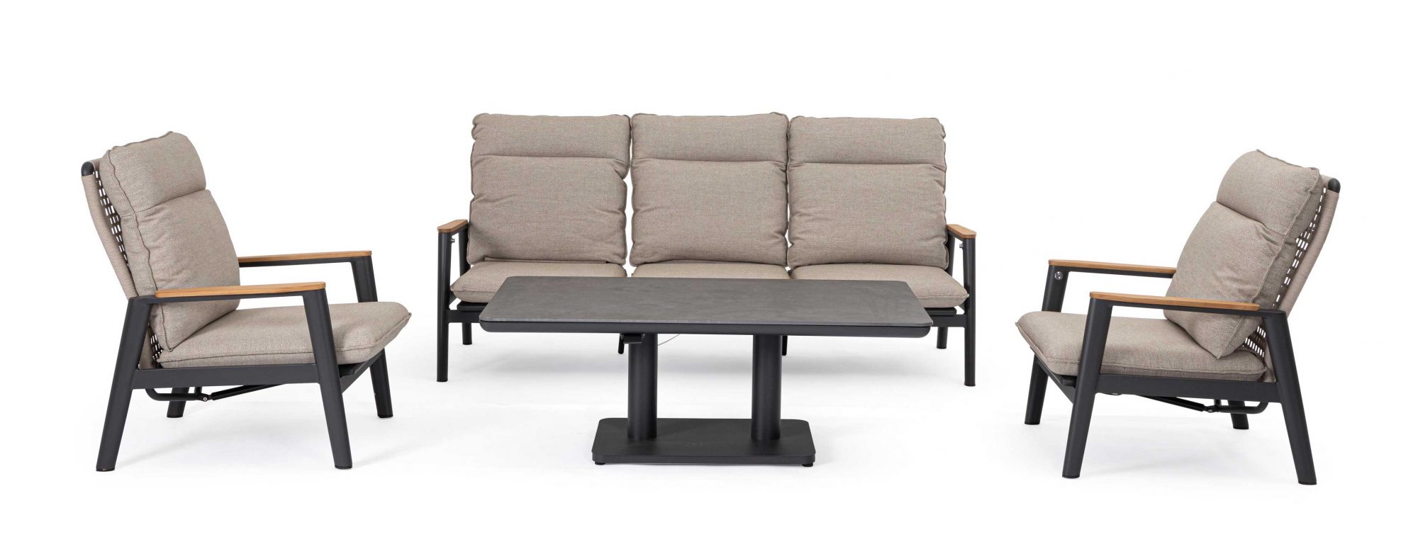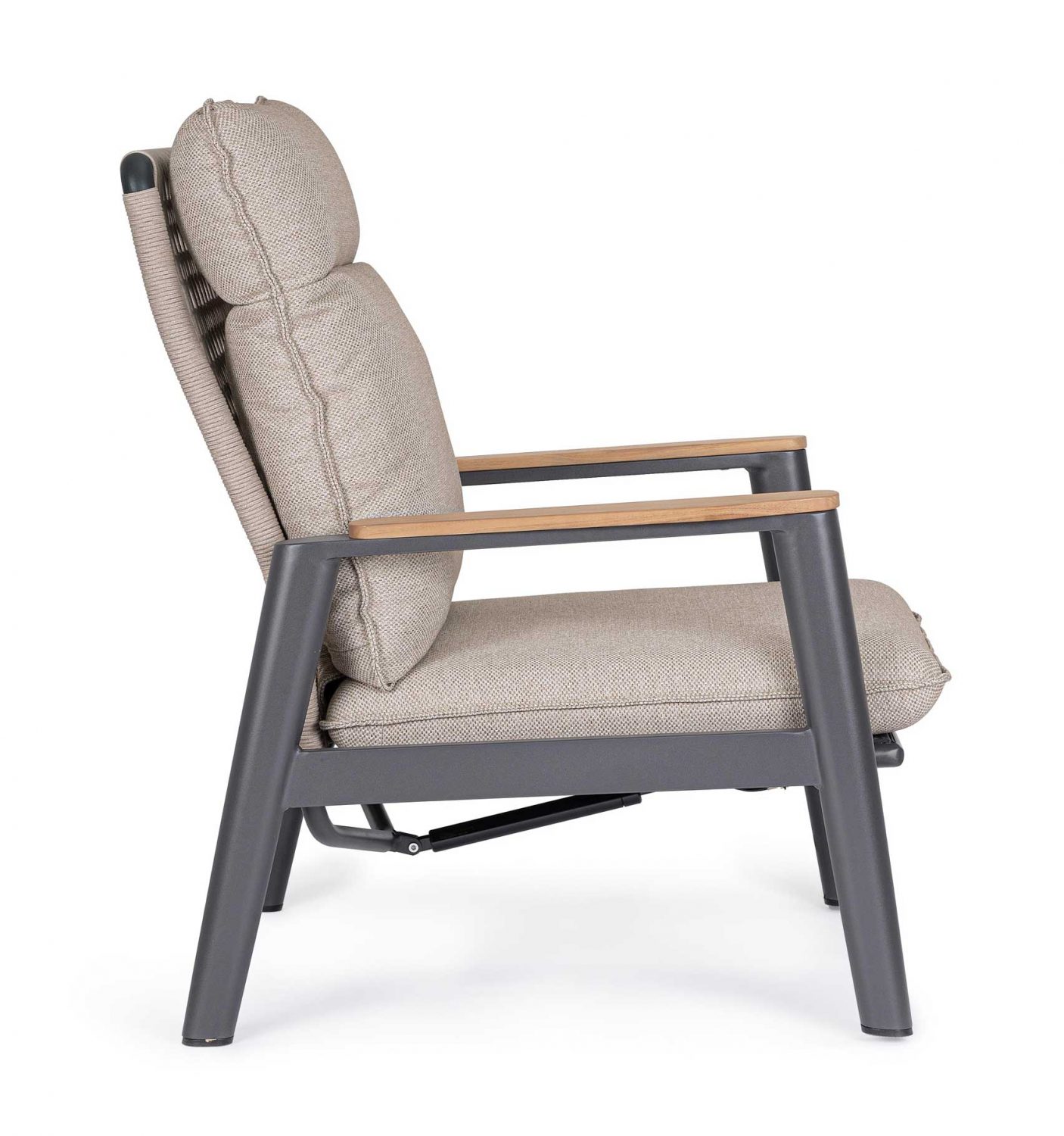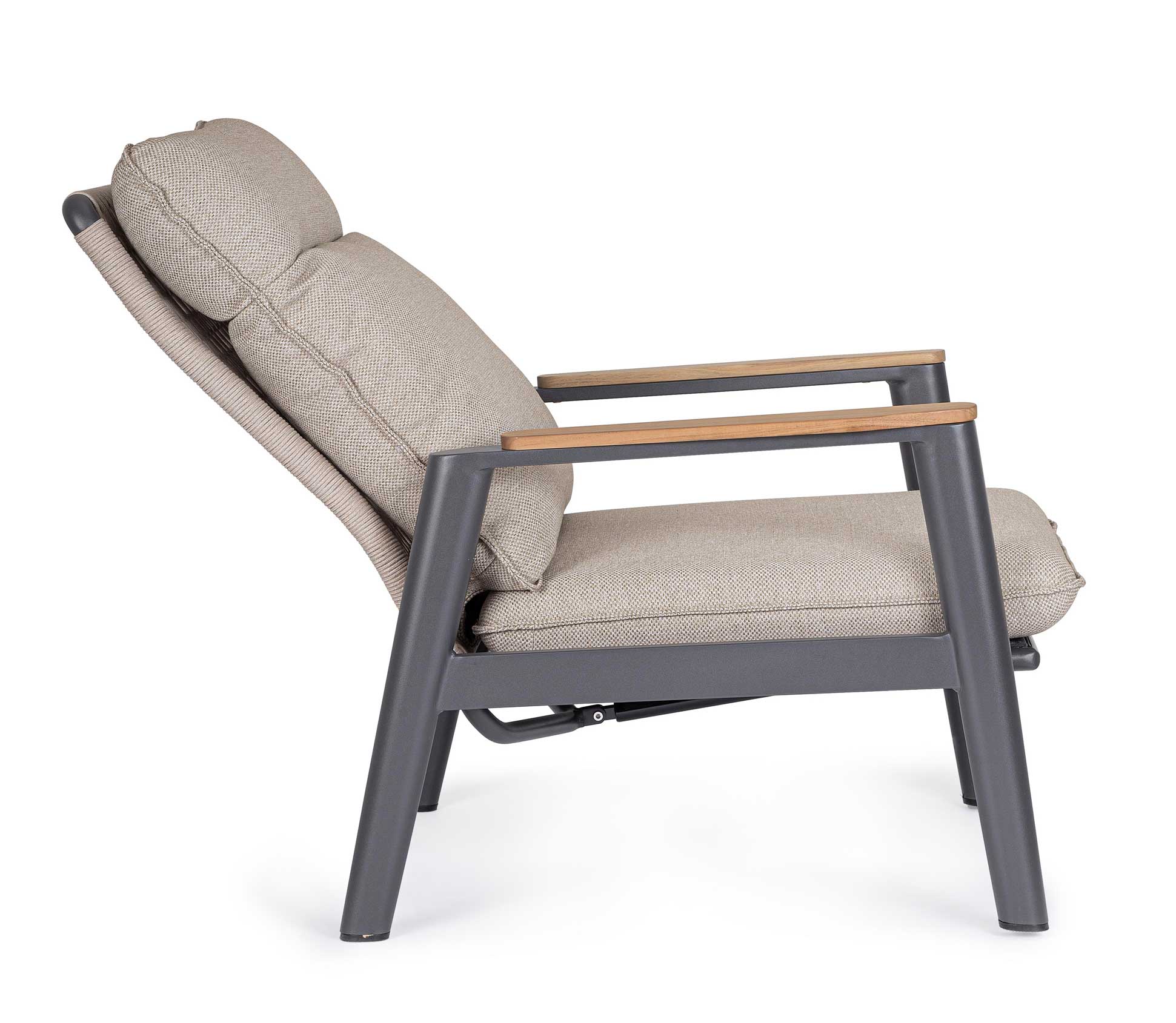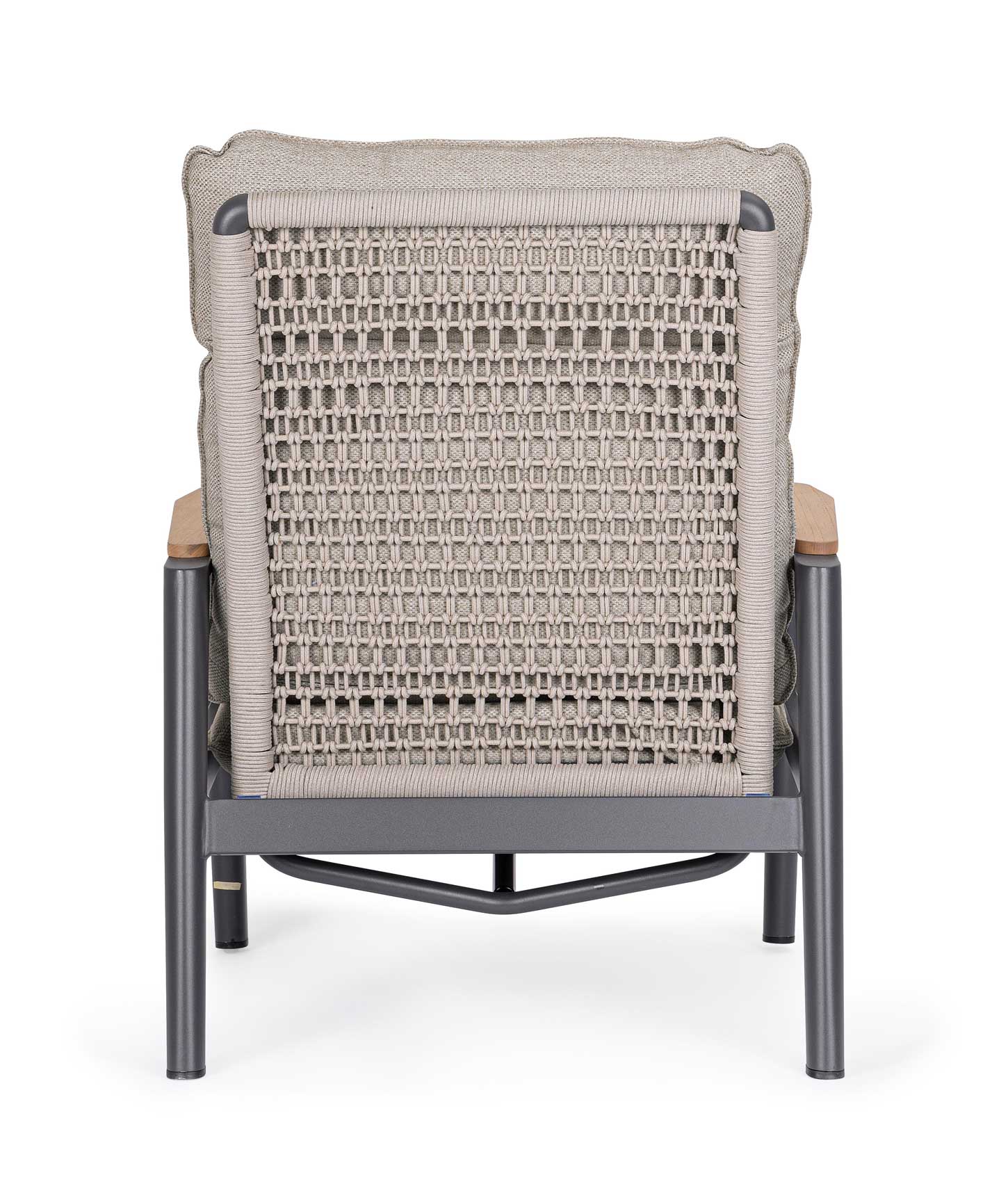 Die Armlehnen mit Teakholz-Beschlag. Kissen aus wasserabweisendem Olefin-Gewebe, mit abnehmbarem Bezug.