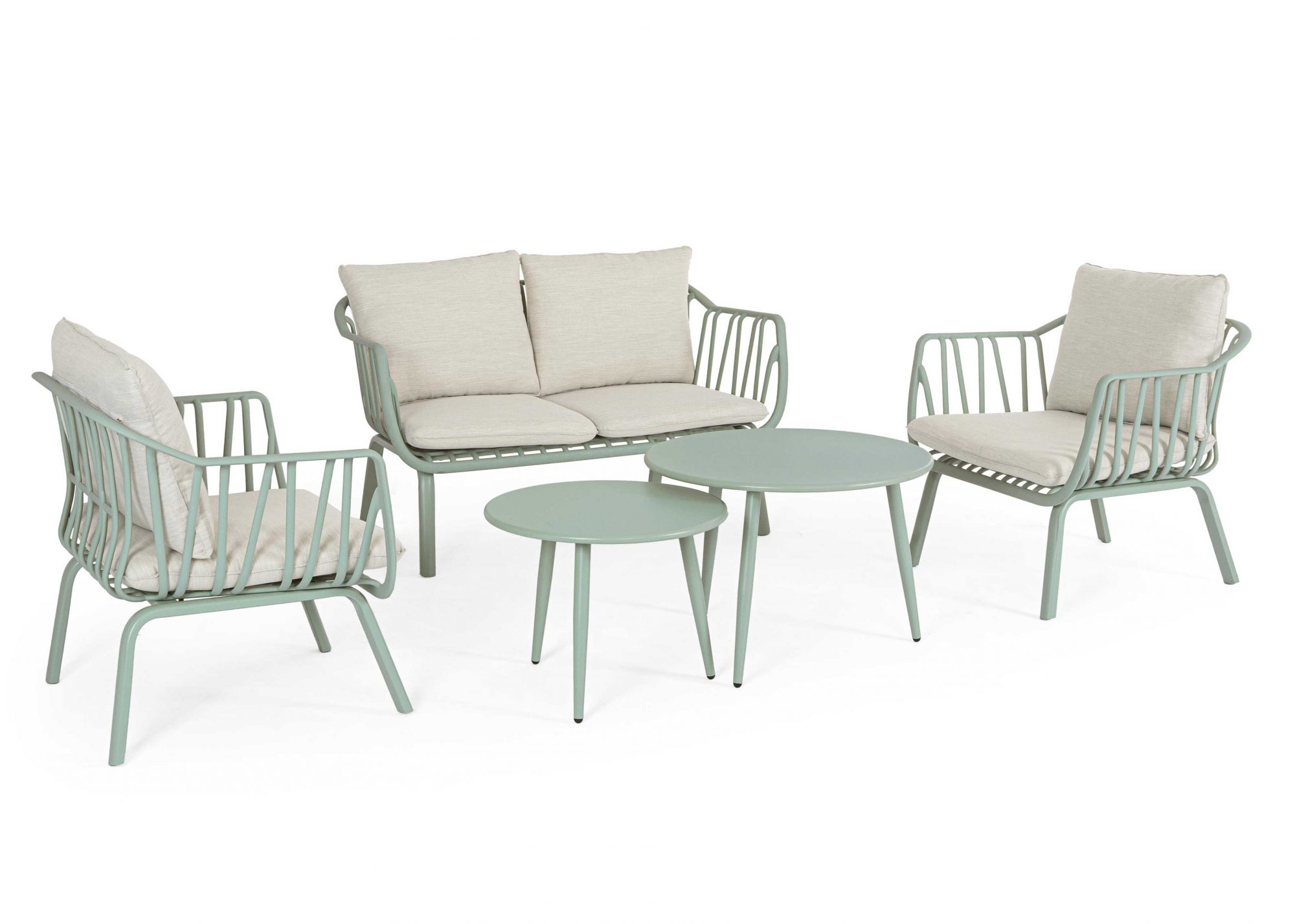 Die Sitzgruppe besteht aus 1 x 2er Sofa, 2 x Sessel und 2 unterschiedlich grossen Tischen. Das Gestell ist pulverbeschichtet. Die abnehmebaren Bezüge der Kissen sind aus wasserabweisendem Polyester und uv-beständig.