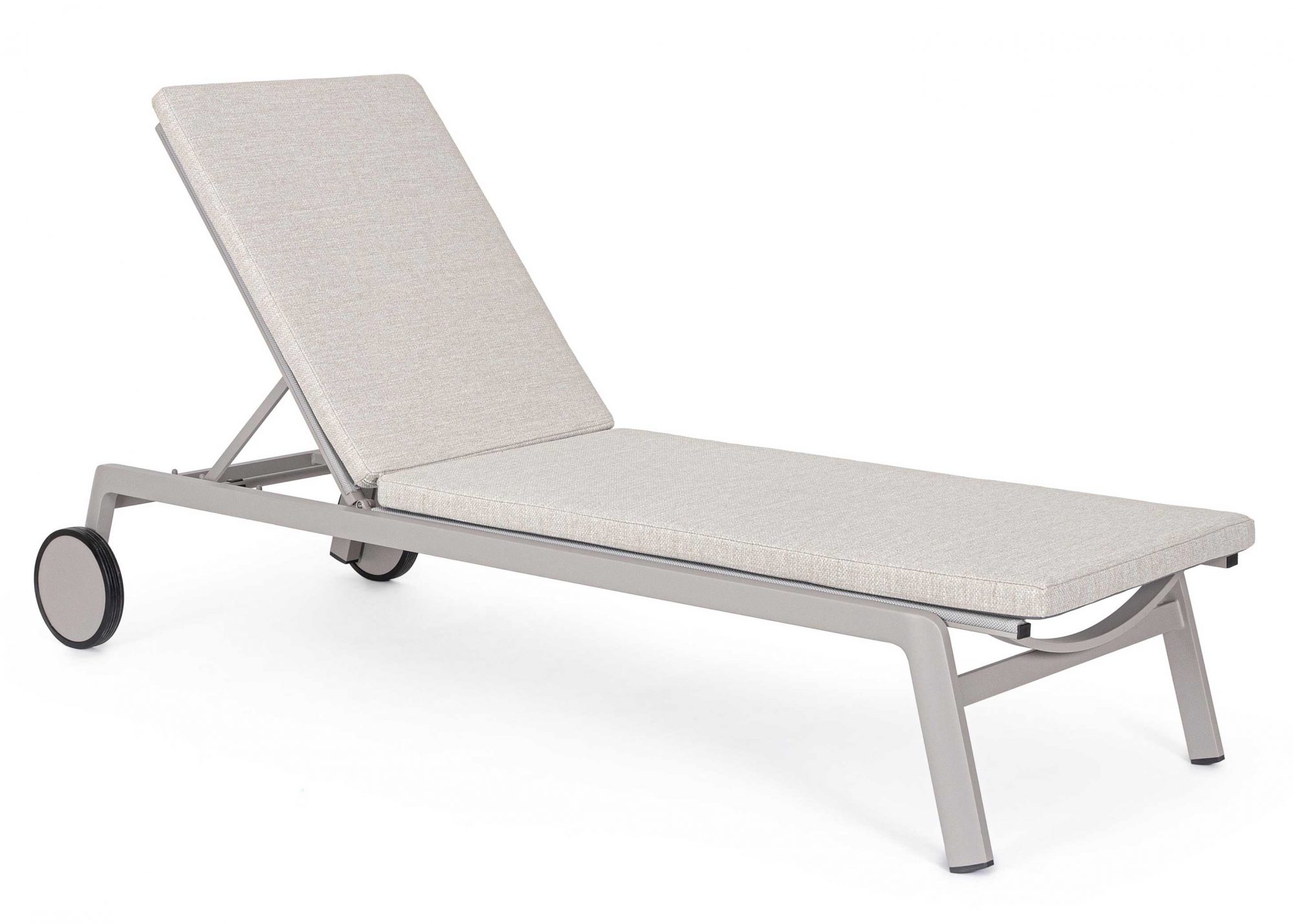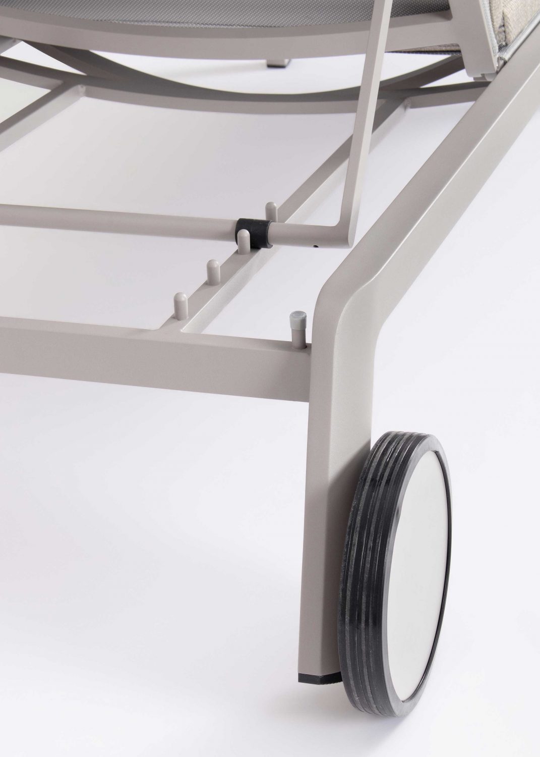 Die Rückenlehne ist in 4 Positionen verstellbar und die Rollen sind mit Gummi bezogen.