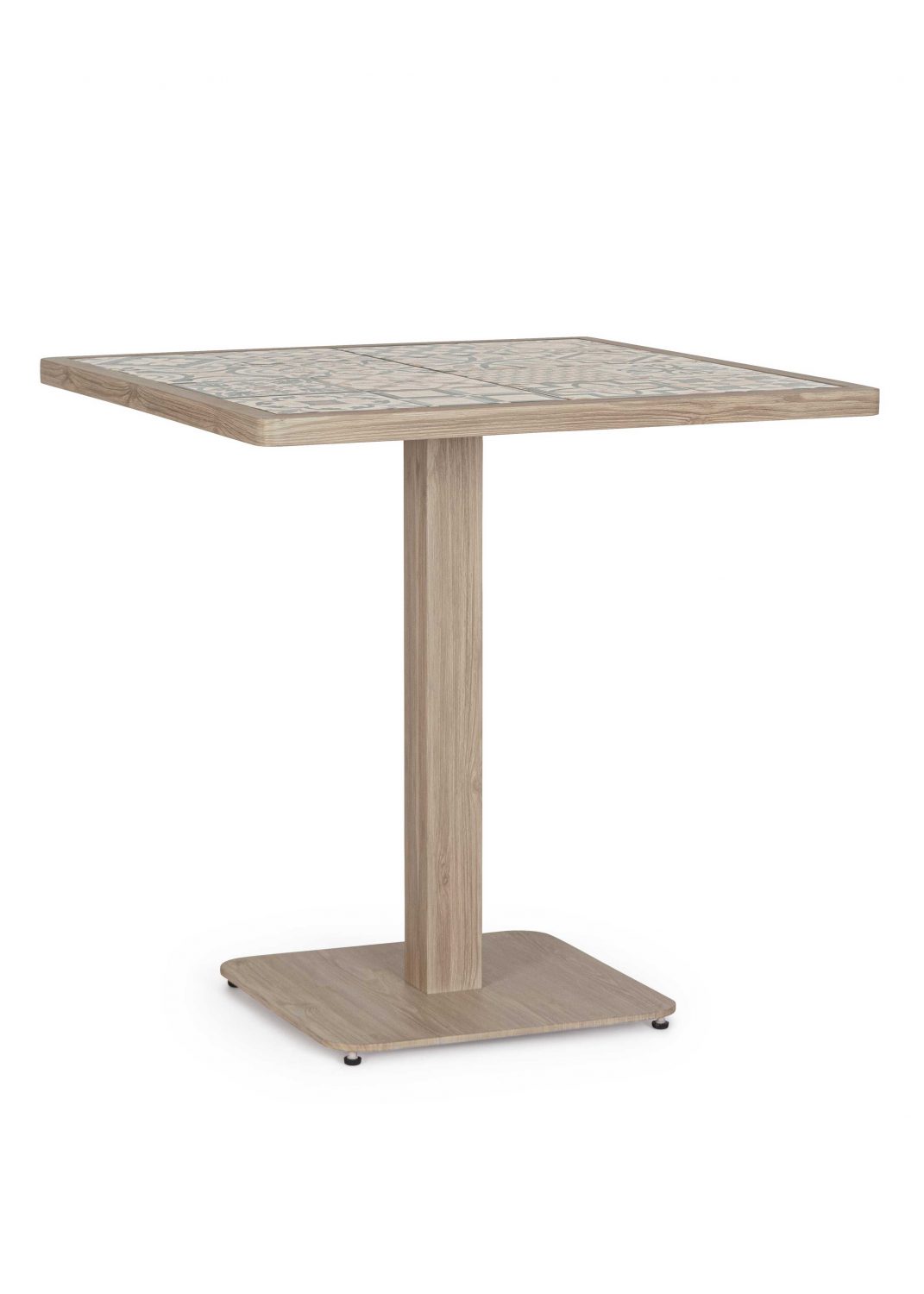 Das Aluminium-Gestell in holzoptik ist pulverbeschichtet. Die Tischplatte besteht aus emaillierten Porzellanfliesen.