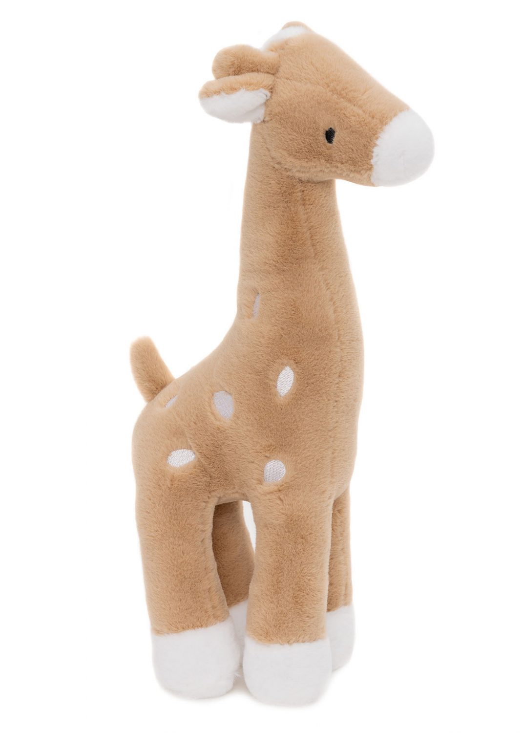 Die Giraffe ist mit gestickten Flecken verziert und hat eine kurze Mähne.