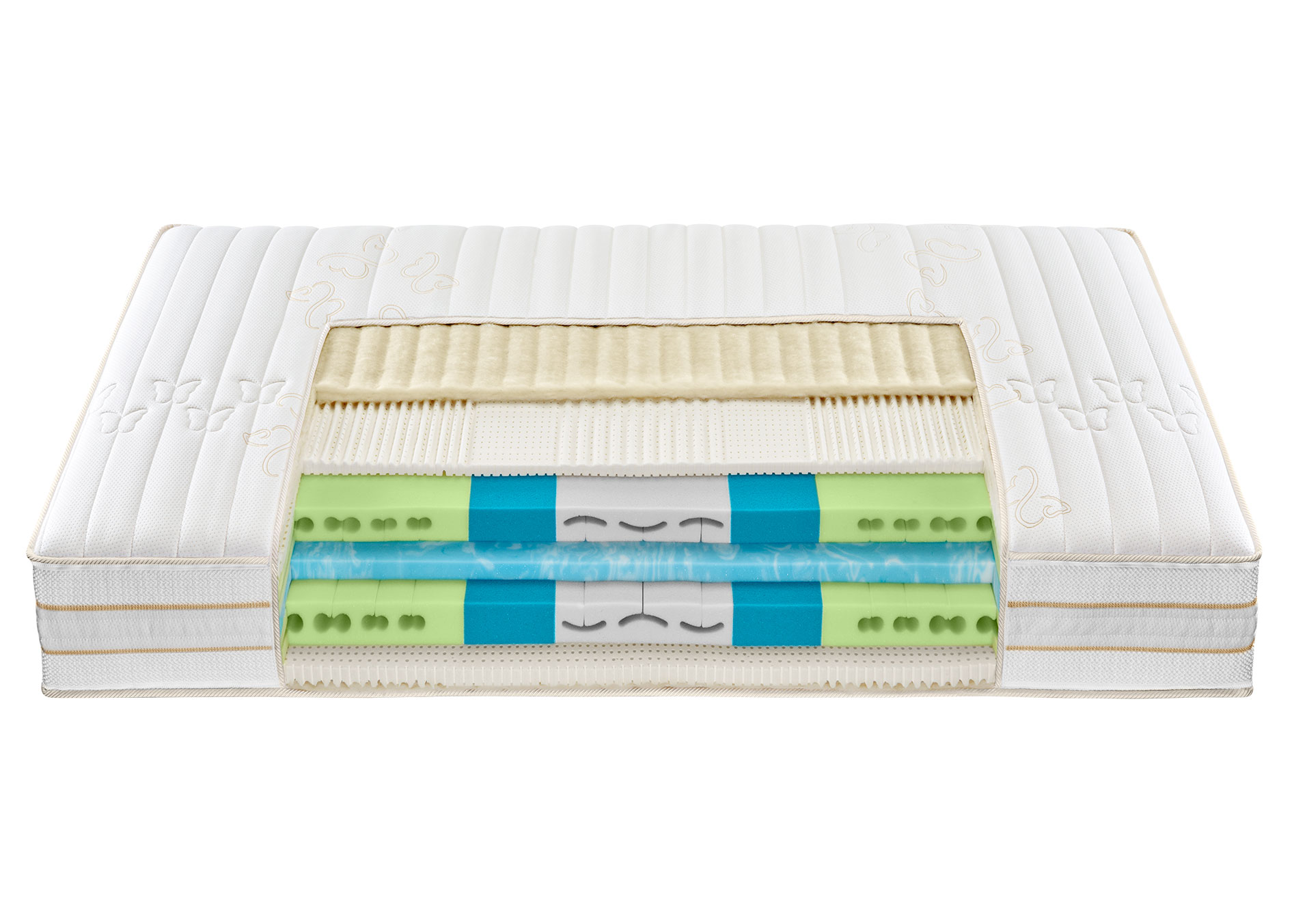 Die Butterfly Emerald Matratze besitzt eine Naturpolster-Auflage aus reiner Schweizer Schurwolle.