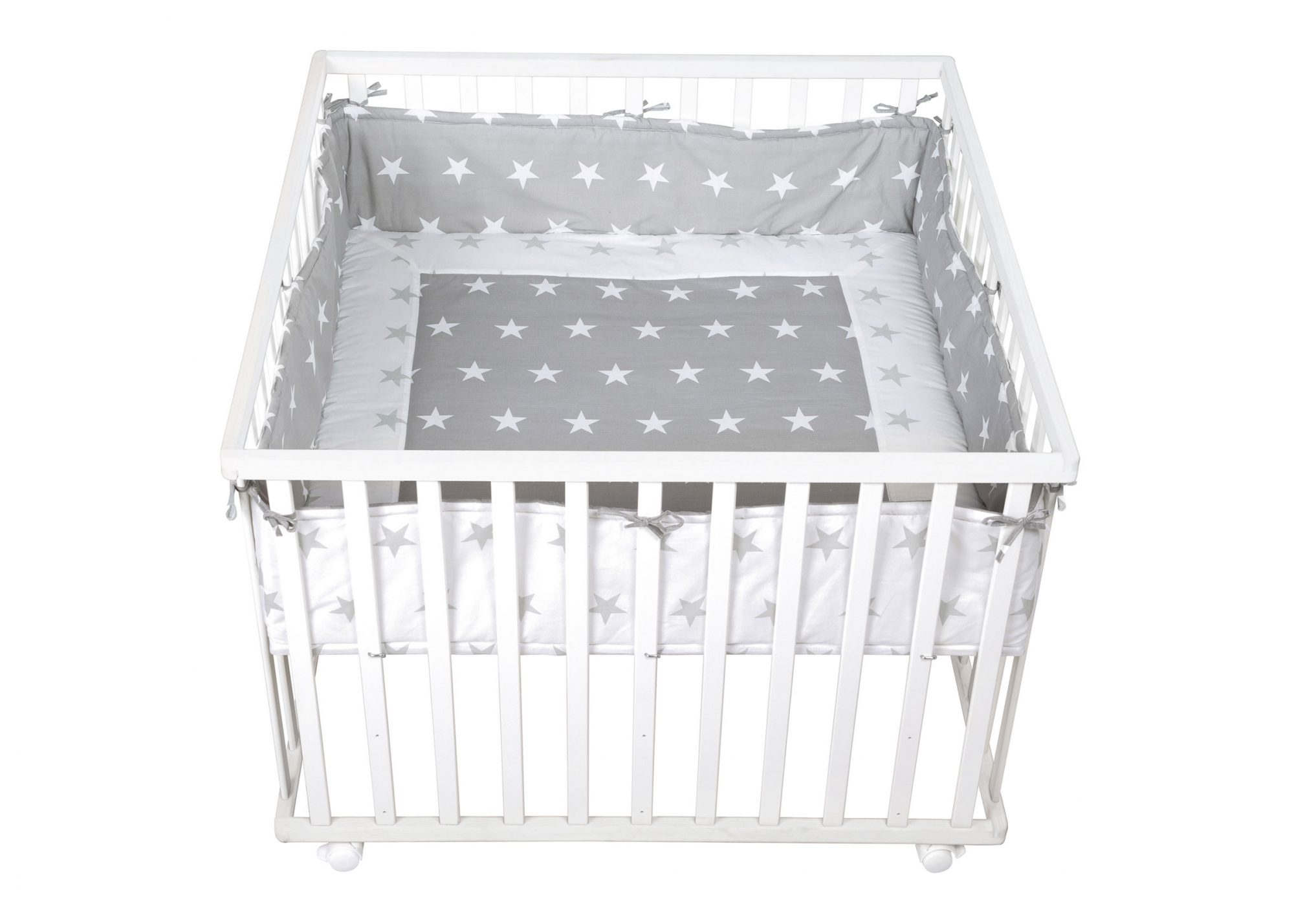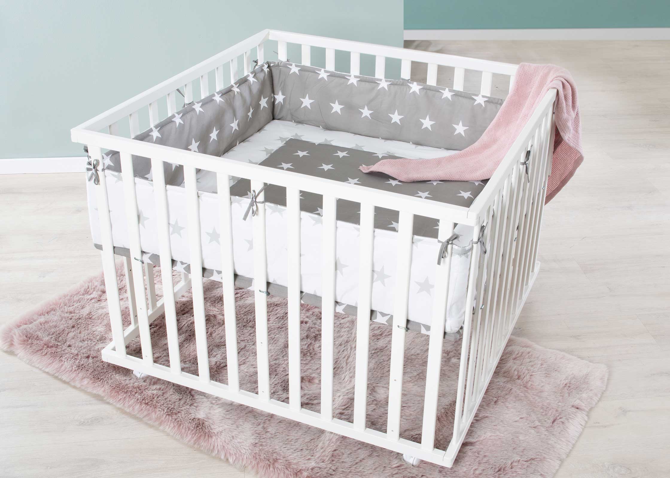 Kindgerechtes und stabiles Laufgitter mit Flachstäben aus Holz, inkl. Stoffeinlage und Bremsrollen. Alle verwendeten Materialien sind zertifiziert und werden regelmässig geprüft.