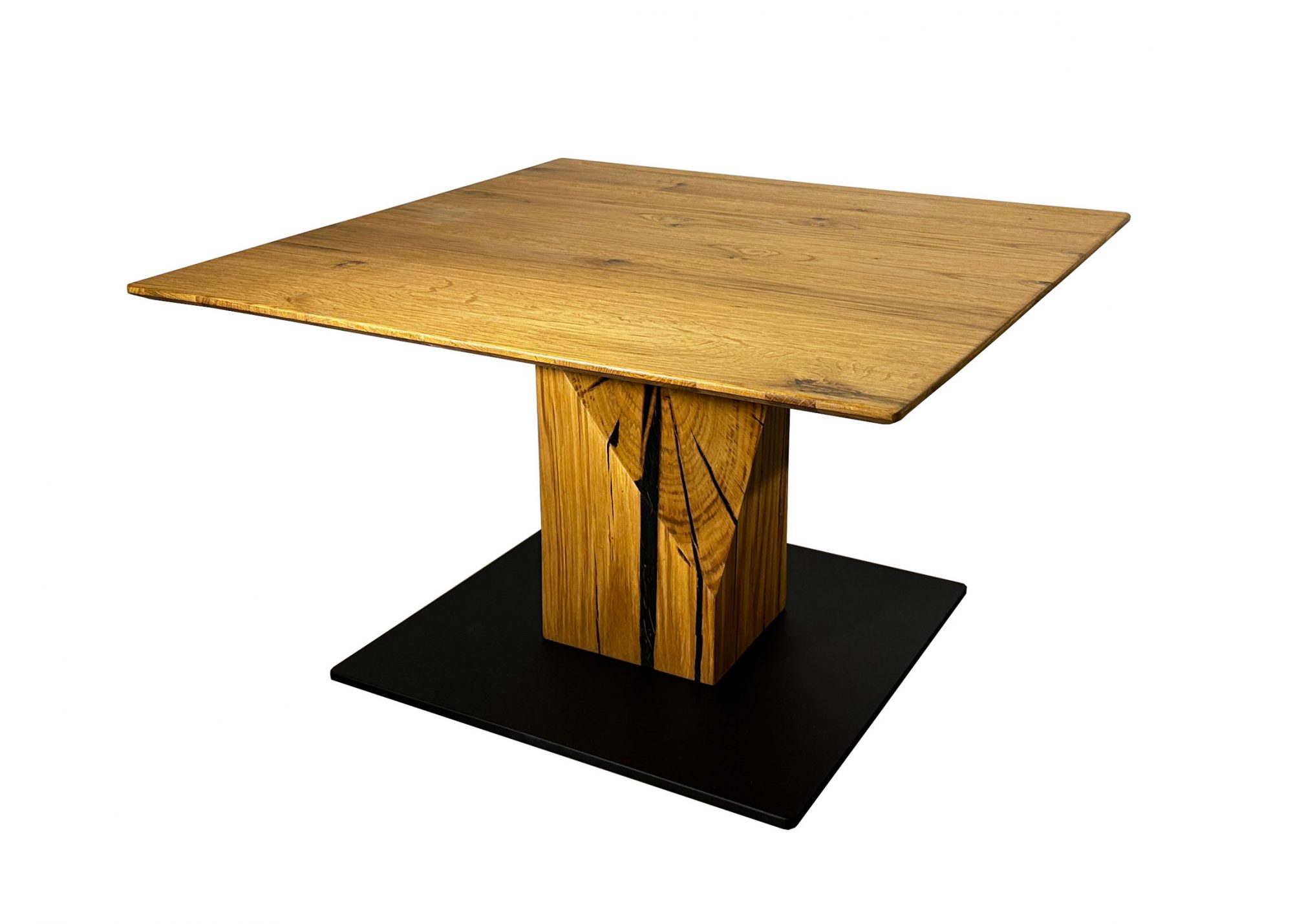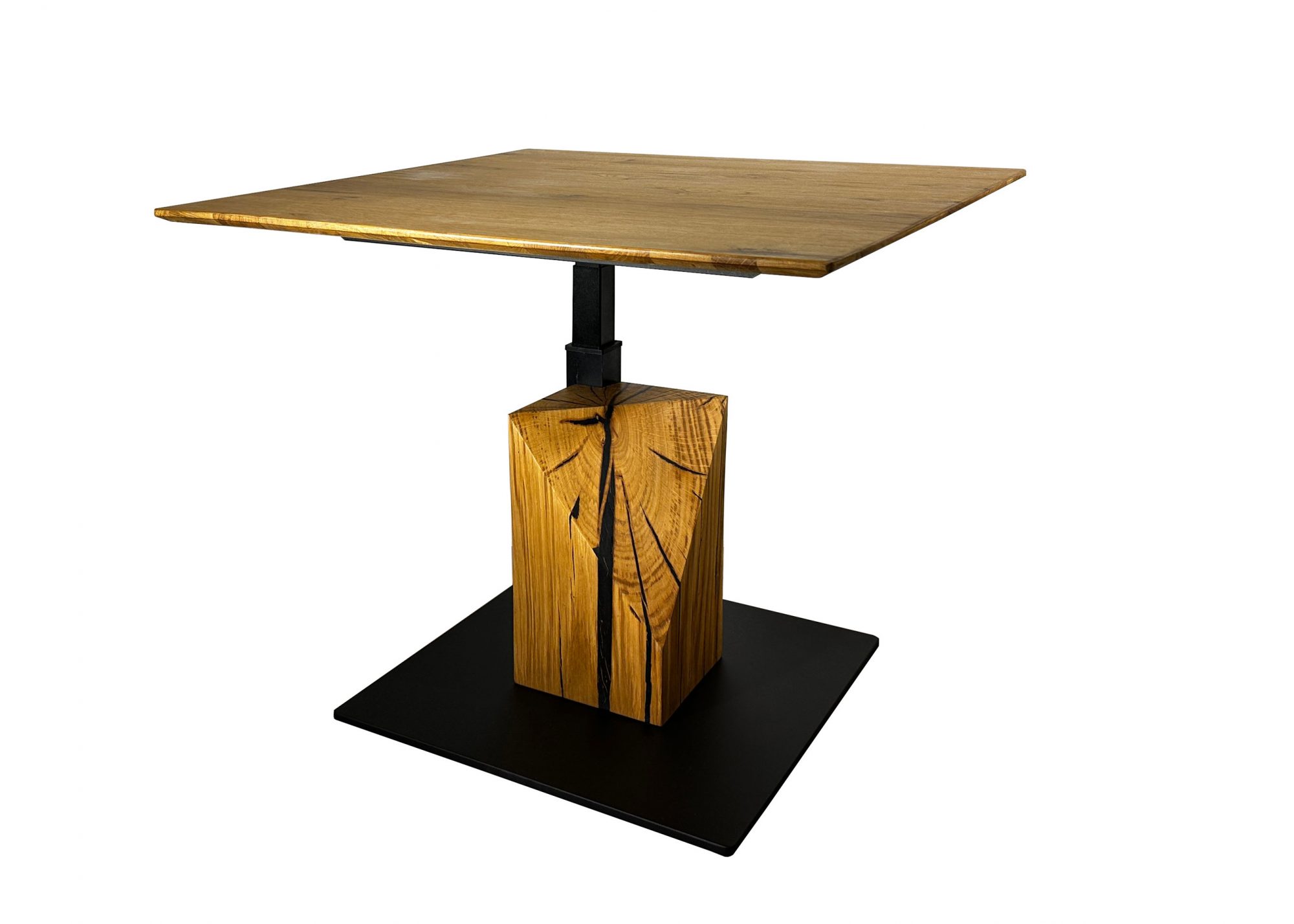 Der Couchtisch mit massiver Eiche ist von 45-63 cm in der Höhe verstellbar.