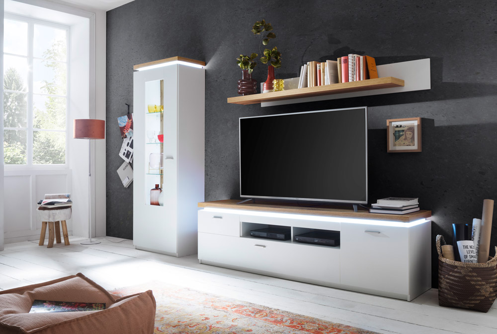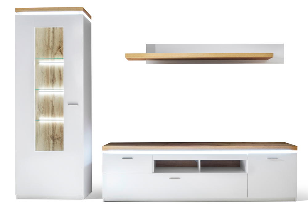 Wohnwand 3-teilig bestehend aus: 1x Vitrine 1 Türe mit Glas BxHxT = 70x197x38 – 1x TV-Element 1 Türe, 2 Schubladen, 2 Fächer BxHxT = 195x57x44cm – 1x Wandboard BxHxT = 65x96x26cm