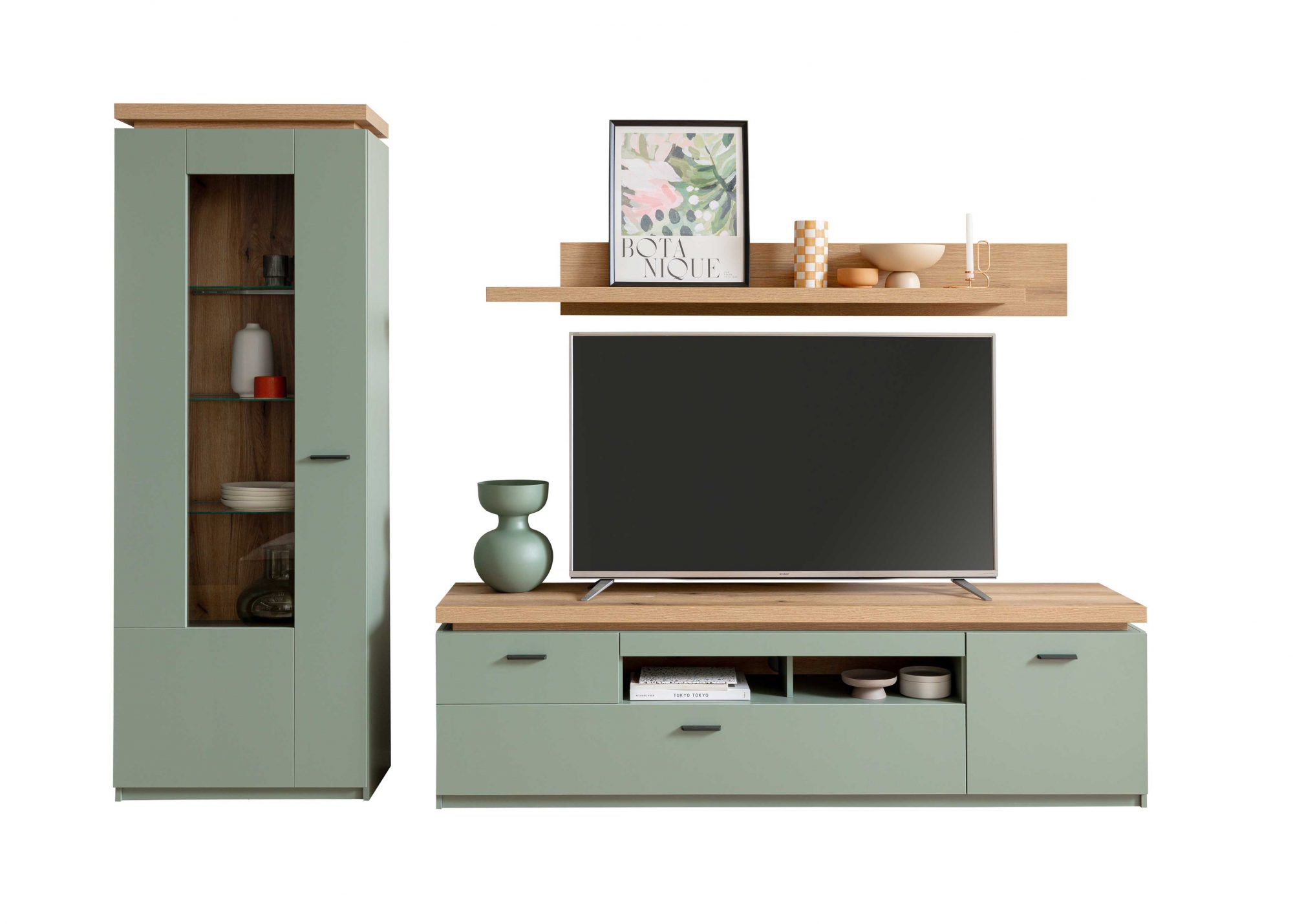 Die Moniz Wohnwandkombination besteht aus 1 x Vitrine BxHxT: 70x197x38 cm, 1 x TV-Element BxHxT: 195x57x44 cm und 1 x Wandboard BxHxT: 175x22x26 cm.
